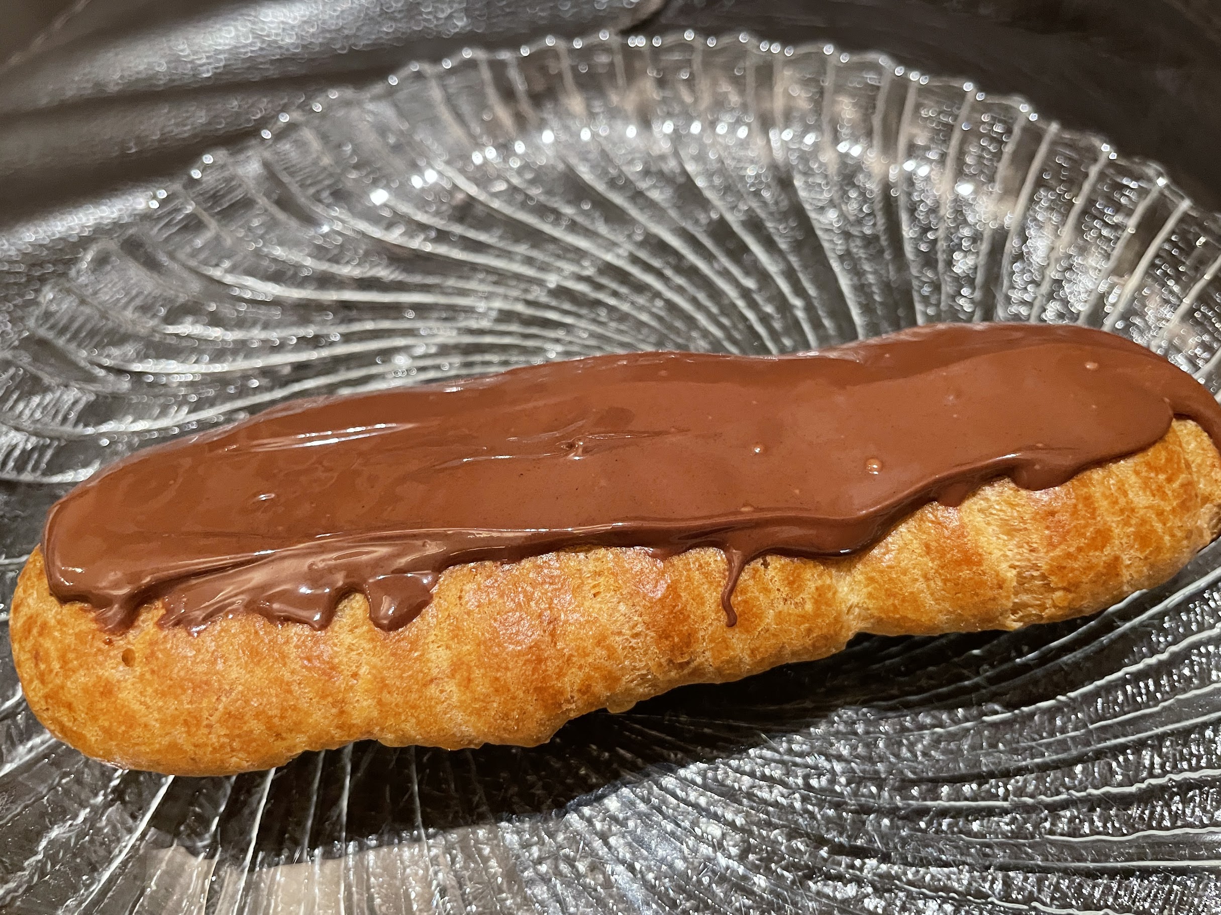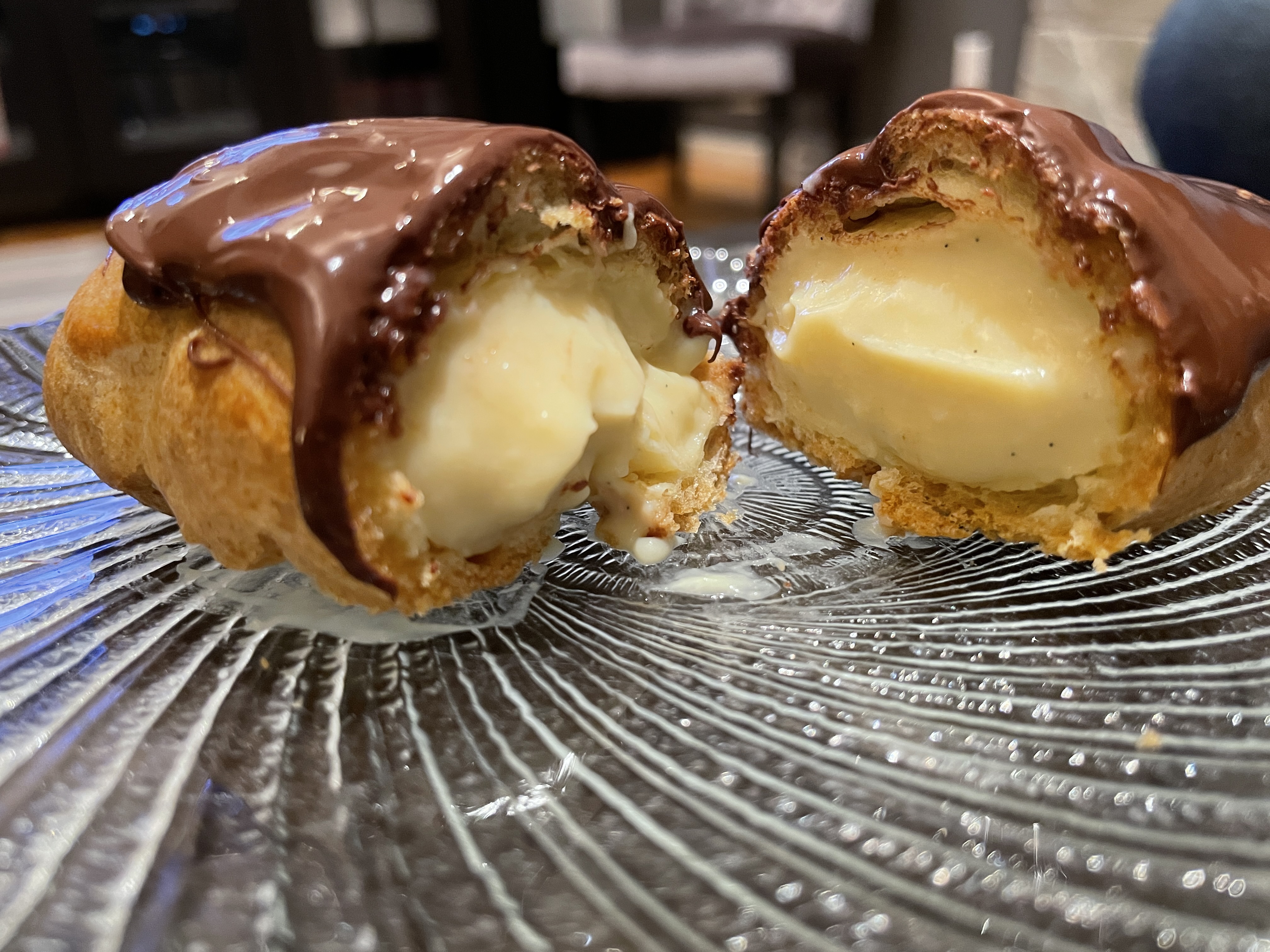 Hollow pate a choux dough cooked to golden perfection, filed with silky smooth vanilla pastry cream, and dipped in semi-sweet chocolate.