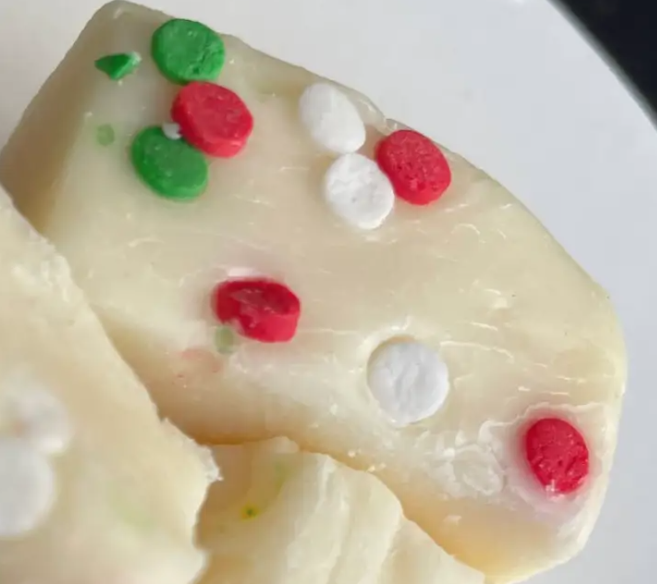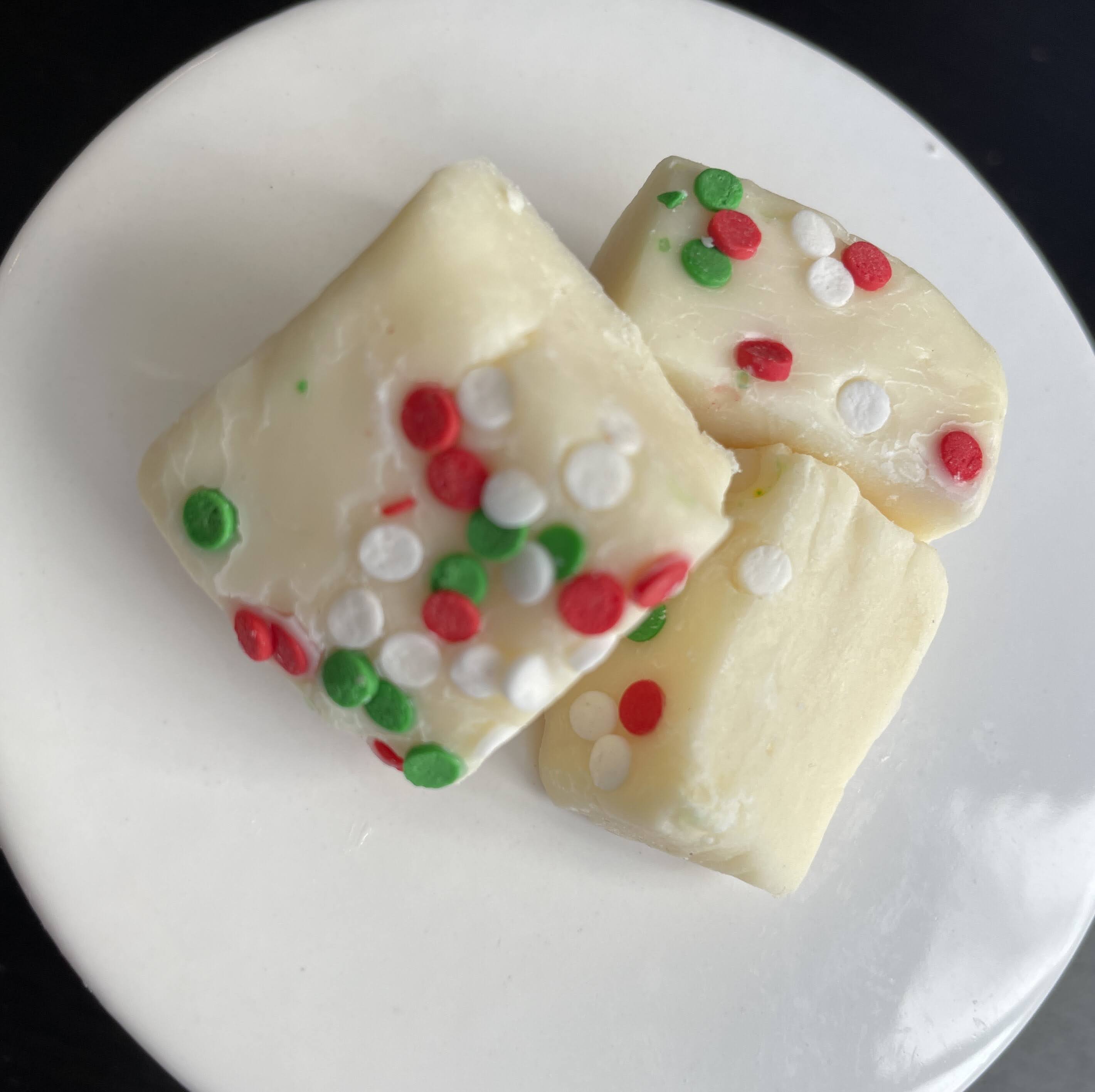 White chocolate fudge flavored with almond and decorated with festive sprinkles.