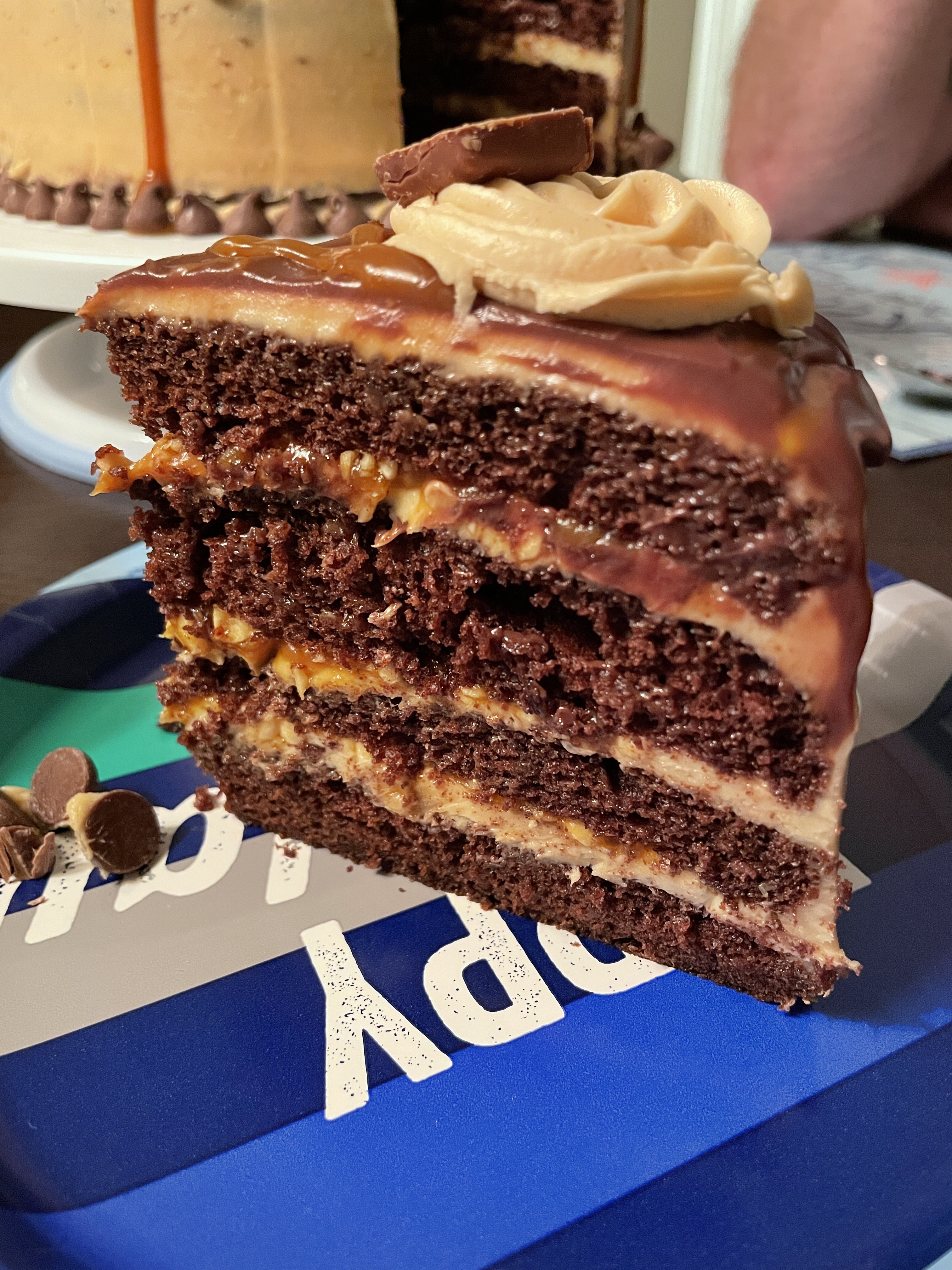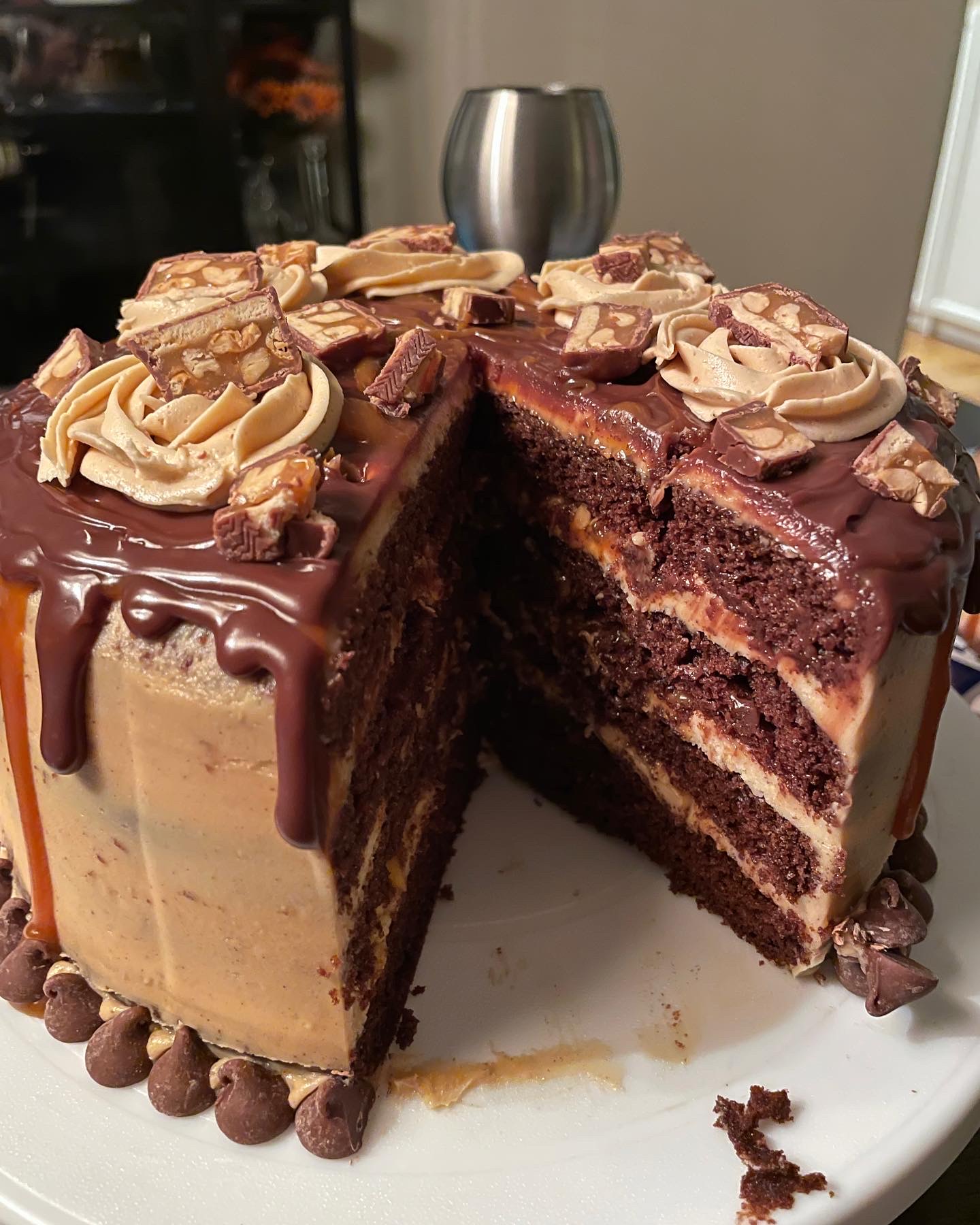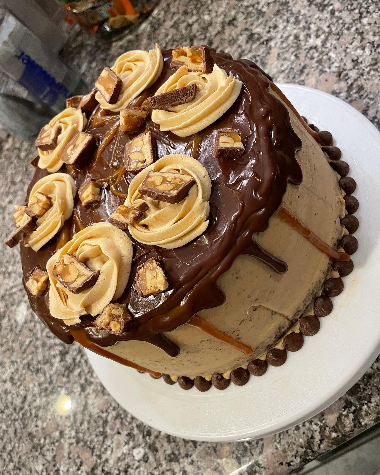 Chocolate cake layered with peanut butter buttercream, caramel, and caramel buttercream, iced with caramel and peanut butter buttercreams. Decorated with caramel and chocolate drip, and real snickers pieces, this cake tastes like a real snickers.
