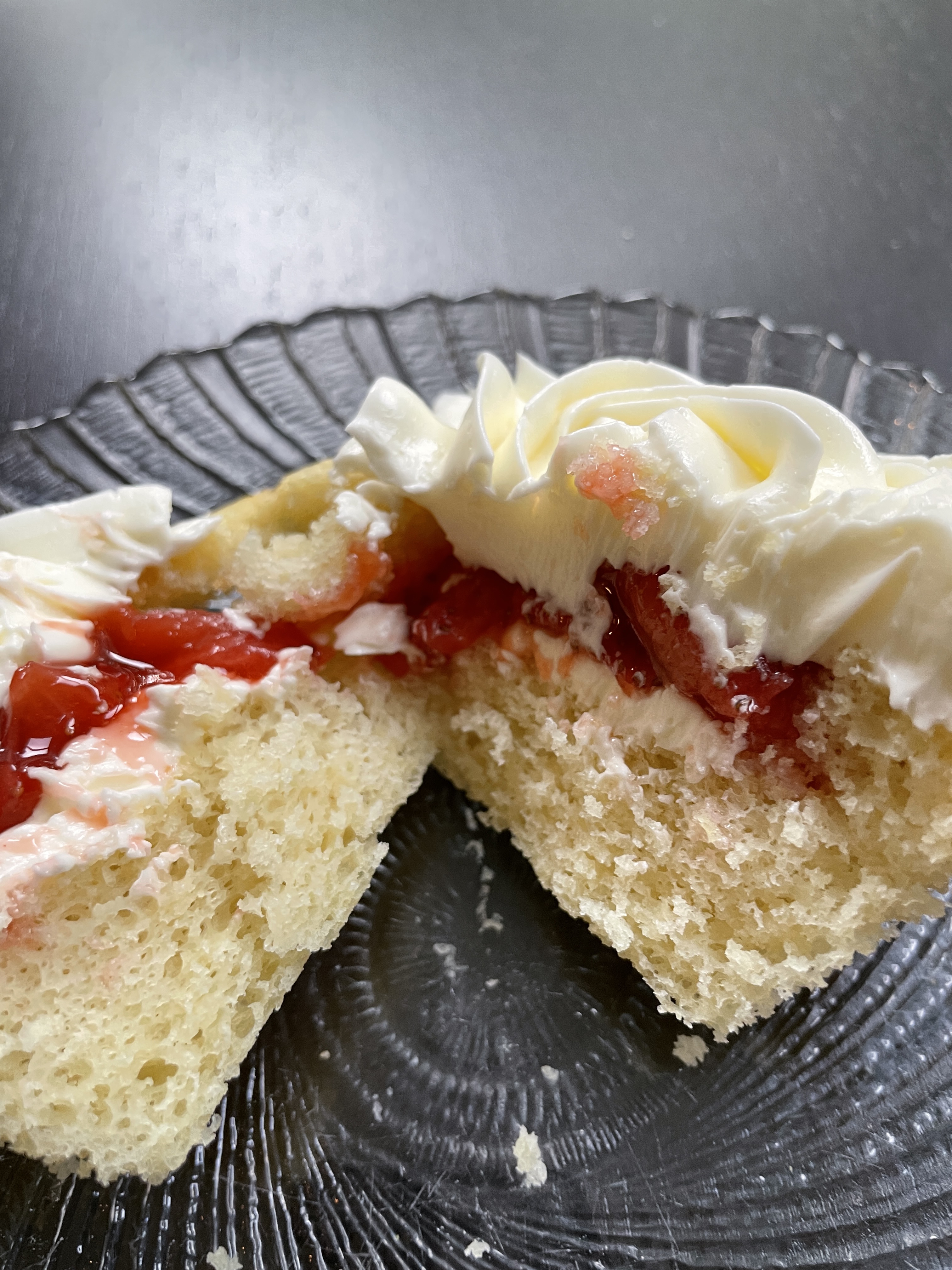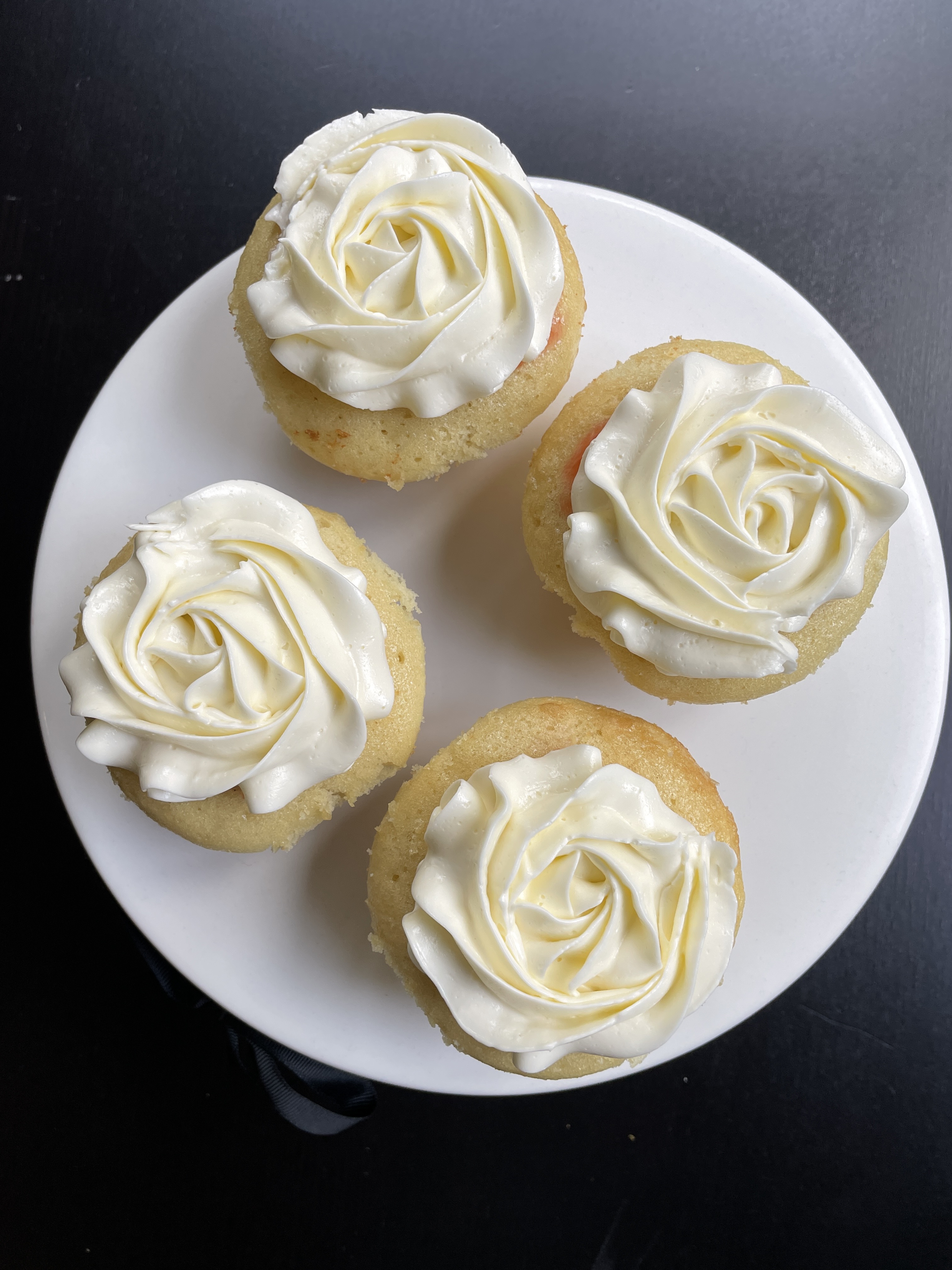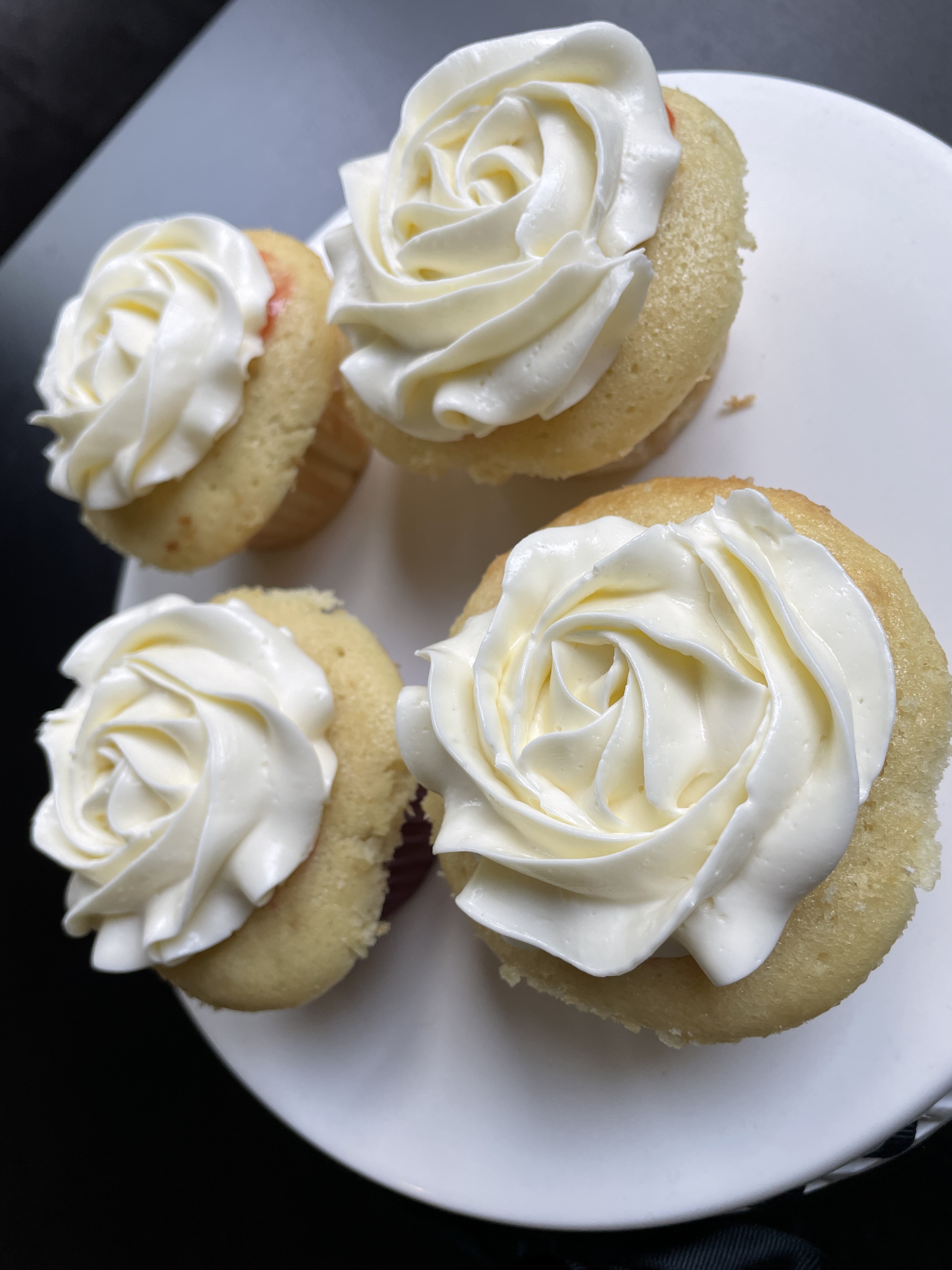 Strawberry Prosecco Cupcakes French vanilla cake, filled with a strawberry reduction, and frosted with Prosecco Swiss Buttercream frosting.